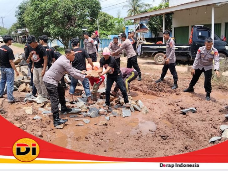LAMPUNG, DeRAPINDONESIA.ID Personel Satuan Brimob Polda Lampung dari Kompi 2B Pelopor melaksanakan aksi kemanusiaan dengan membantu pembenahan jalan berlubang di beberapa titik di Desa Tegal Gondo, Kecamatan Purbolinggo, Kabupaten Lampung Timur.