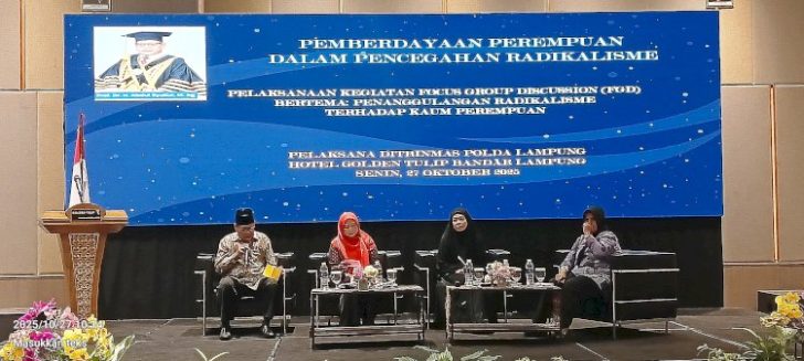 Lampung, Derap Indonesia – Ditbinmas Polda Lampung melaksanakan FGD pencegahan radikalisme. Kegiatan itu diikuti oleh 150 orang perempuan sebagai peserta dan digelar di Golden Tulip,Senin (27/10/2025)