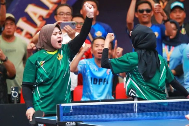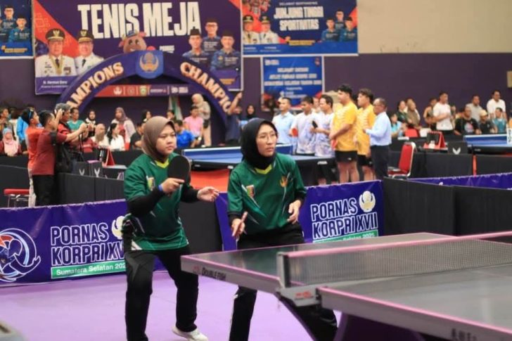 PALEMBANG,DeRAP INDONESIA — Kabar membanggakan datang dari arena Pekan Olahraga Nasional (Pornas) Korpri XVII tahun 2025 di Palembang. Tim Tenis Meja nomor Ganda Putri Umum Provinsi Lampung sukses mempersembahkan medali perak pertama bagi kontingen Lampung pada pertandingan yang digelar di Pitstop Table Tennis Centre, Palembang, Kamis (9/10/2025).