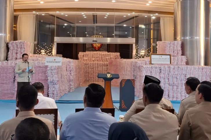 Penyerahan uang hasil penyelamatan kerugian negara dengan total senilai Rp 6.625.294.190.469,74 diserahkan secara simbolis oleh Jaksa Agung RI ST Burhanuddin kepada Menteri Keuangan RI.