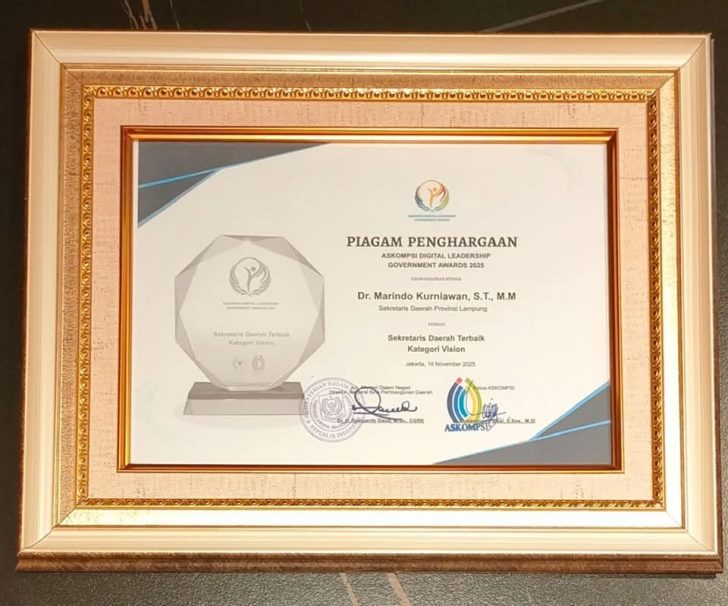 Surabaya, Derap Indonesia – Pemerintah Provinsi Lampung kembali menorehkan prestasi di tingkat nasional, Sekretaris Daerah Provinsi Lampung, Dr. Marindo Kurniawan, S.T., M.M., meraih penghargaan Sekda Terbaik Kategori Vision dan berhasil menempati peringkat ke-4 nasional pada ajang ASKOMPSI Digital Leadership Government Award 2025, yang berlangsung di Hotel Mercure, Jalan Raya Darmo, Surabaya, pada Kamis (20/11/2025).